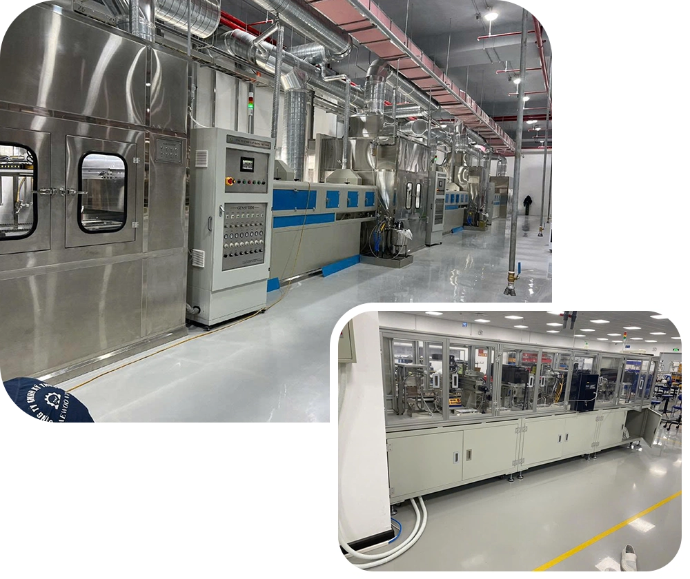 • Hệ thống băng tải, con lăn và các robot công nghiệp được kết hợp nhịp nhàng với nhau.